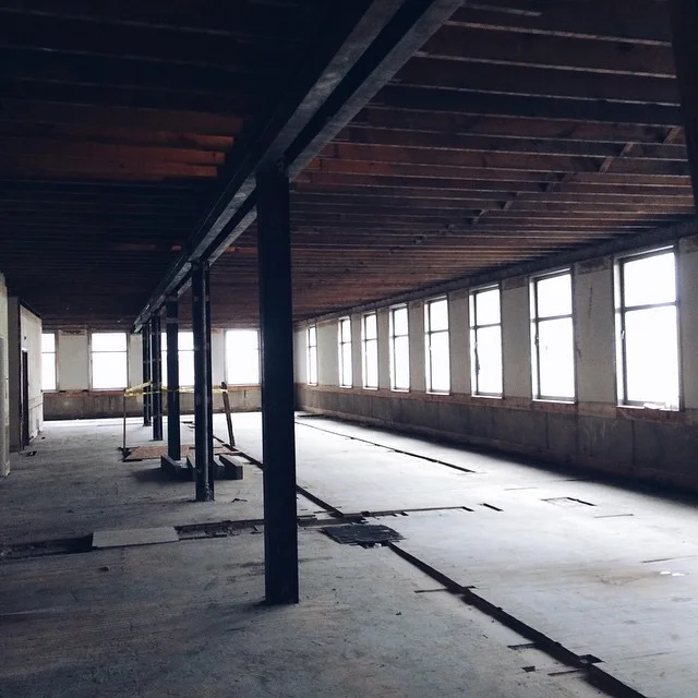 here's a shot from the fourth floor of a building i'm currently working on. the light coming through these windows, the rhythm of the window bays, the feel of the raw space, the exposed ceiling joists above... that's art all on its own already.